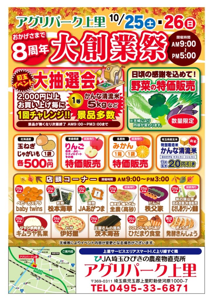 アグリパーク上里にて『大創業祭』開催‼️ いつもJA埼玉ひびきの農産物直売所をご利用いただき誠にありがとうございます。 日頃の感謝を込めて大創業祭を開催!! 開催日 10月25日(土)〜26日(日) 開催時間 午前9時〜午後5時 📍アグリパーク上里 目玉イベント👀✨ \大抽選会開催/ 2,000円以上お買い上げ毎に1回チャレンジ( •̀ •́ )୨⚑︎゛ 1等はかんな清流米5kgなど•••景品多数!(⑉>ᴗ<ノノ゙ \上里町産梨リキュール販売🍸/ 数量限定で上里町産梨リキュール『月にあこがれた梨』販売🌙*.。 \店頭コーナー/ 開催時 午前9時〜午後5時 【25日(土)出店】 •baby twins : ベビーカステラ販売 •松本海草 : 乾物販売 •JAあがつま : 漬物販売 •全農(高砂食品) : 焼そば•焼うどん販売 •秩父家 : だんご販売 •むさし野グリーン農園 : 味の狭山茶詰め放題•特価販売 ・キムラヤ乳業 : ジャンボ肉まん販売 【26日(日)出店】 •伊好屋 : ピザ販売 •茨木海苔 : 庄屋さんの昆布販売 •ひだまり食堂 : シフォンケーキ•からあげ販売 【両日出店】 •発酵きんしょう : ぎょうざ販売 皆さまのお越しを心よりお待ちしております💕